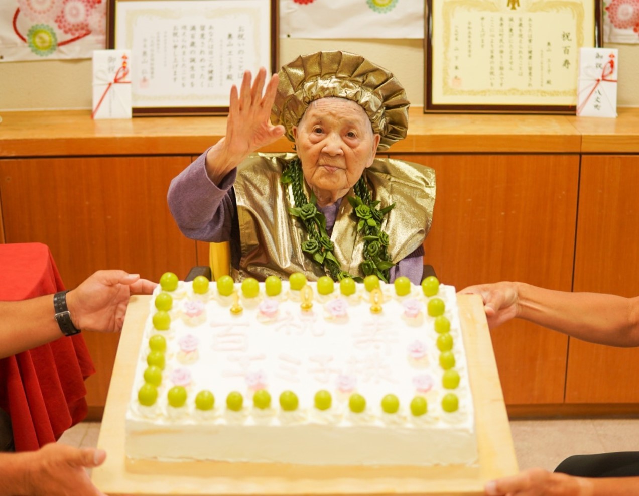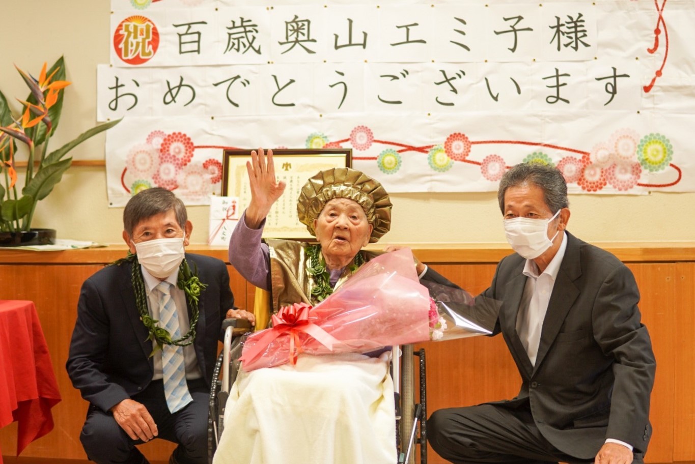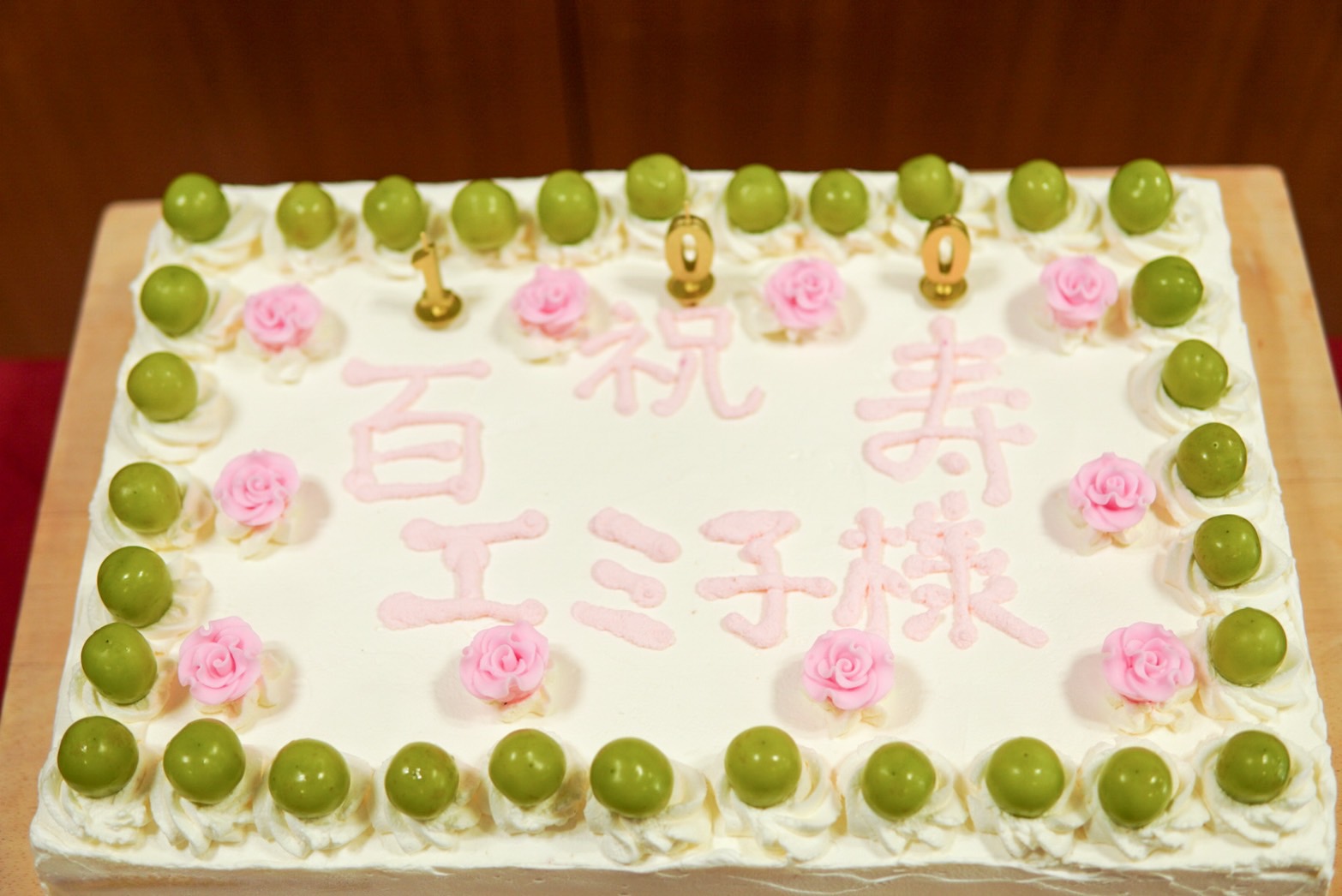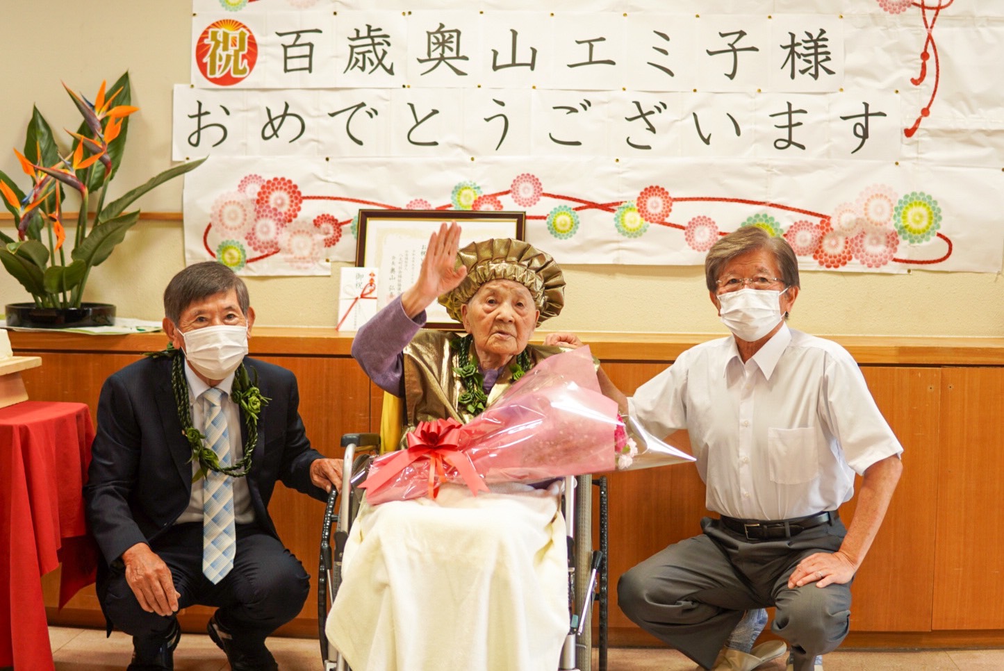 祝・百歳♪お祝い(9月27日) 令和5年9月27日、奥山エミ子様のお誕生日に100歳のお祝いが行われました。 八丈町町長、八丈町社会福祉協議会会長がそれぞれ来所され、直々に表彰状が授与されました。 みなさんの声掛けに「ありがとう」とお返事され、元気なご様子を見せて頂けました。 100歳、おめでとうございます♪