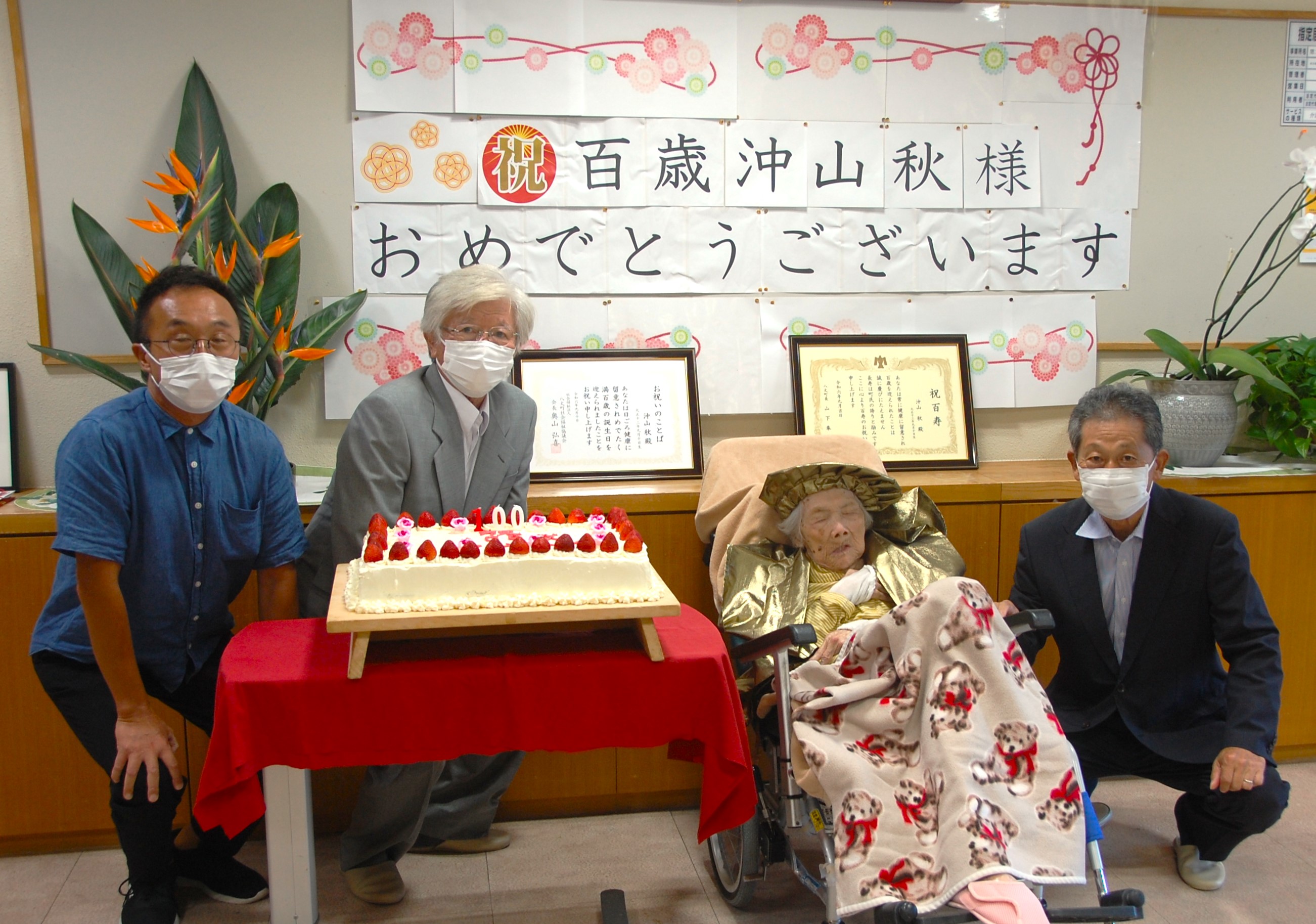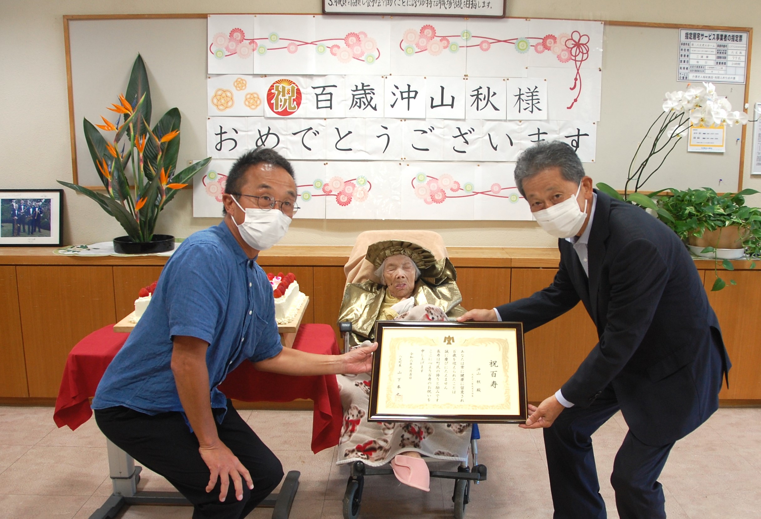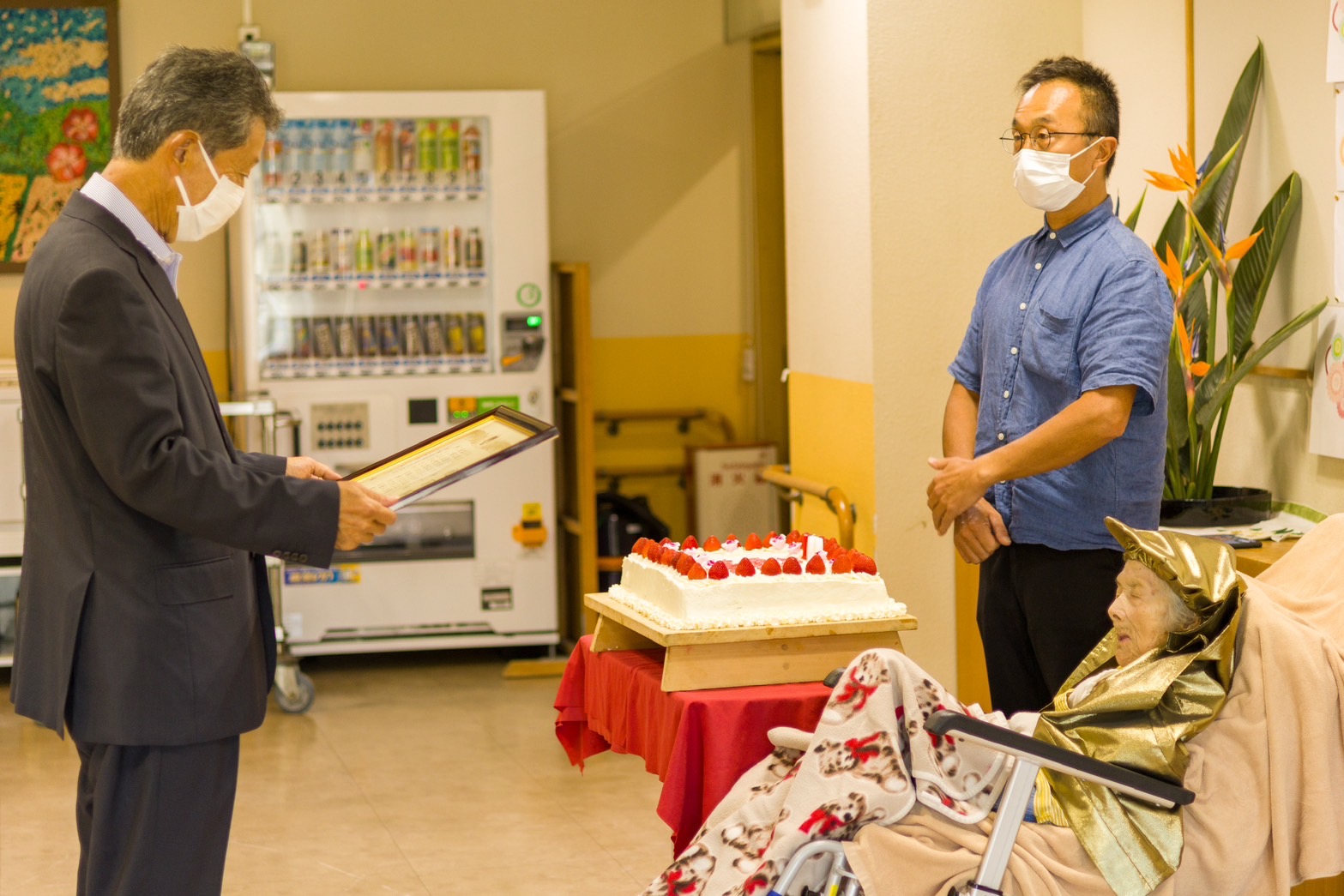 祝・百歳♪お祝い(9月13日) 令和6年9月13日、沖山秋様の100歳のお祝いが行われました。八丈町町長、八丈町社会福祉協議会会長がそれぞれ来所され、表彰状とお祝いが授与されました。 やたけさんから特大のケーキも到着し、会場が華やかになりました。おめでとうございます♪