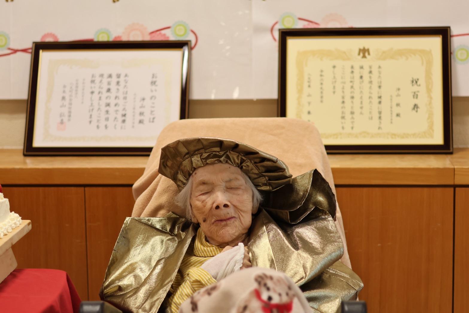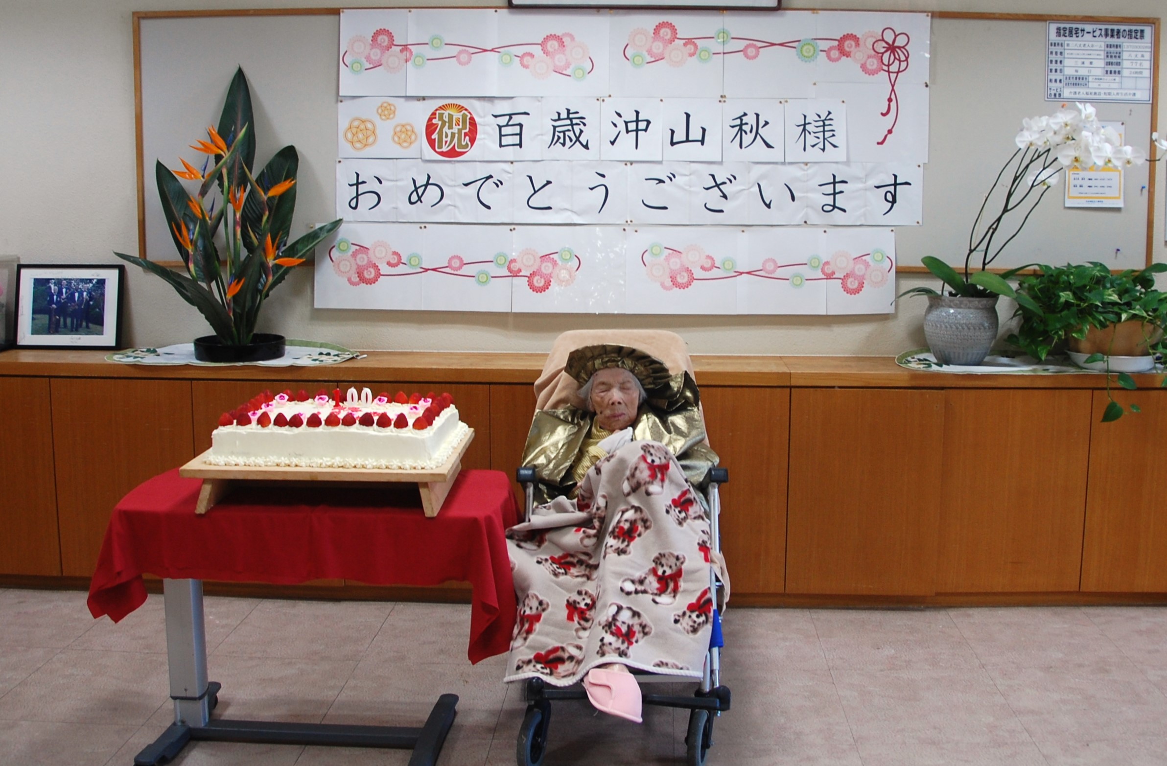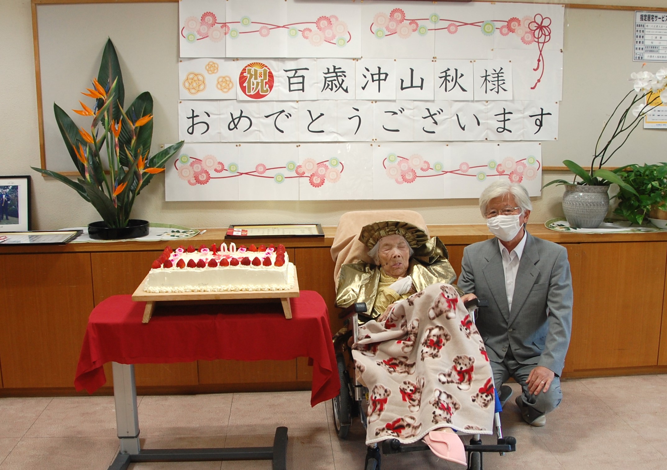 祝・百歳♪お祝い(9月13日) 令和6年9月13日、沖山秋様の100歳のお祝いが行われました。八丈町町長、八丈町社会福祉協議会会長がそれぞれ来所され、表彰状とお祝いが授与されました。 やたけさんから特大のケーキも到着し、会場が華やかになりました。おめでとうございます♪