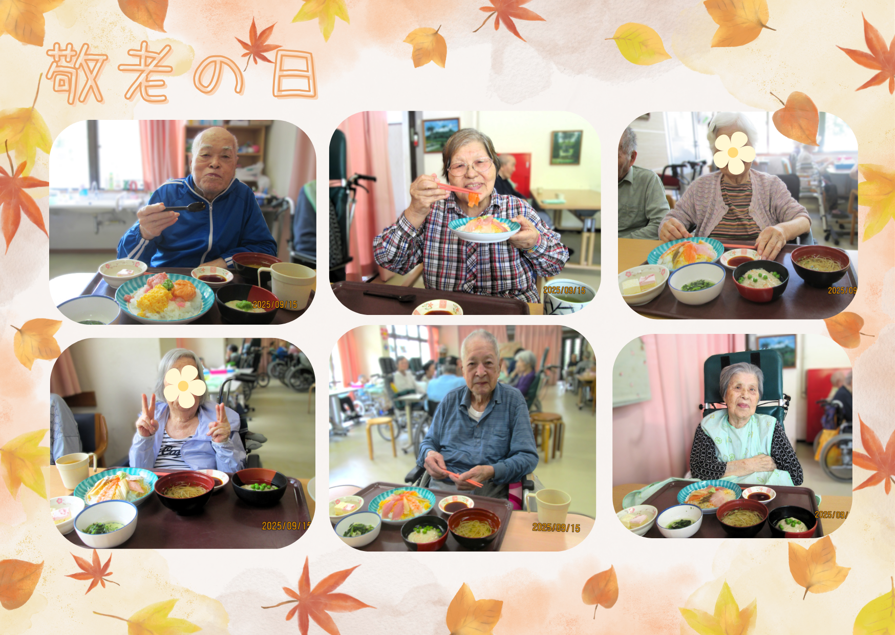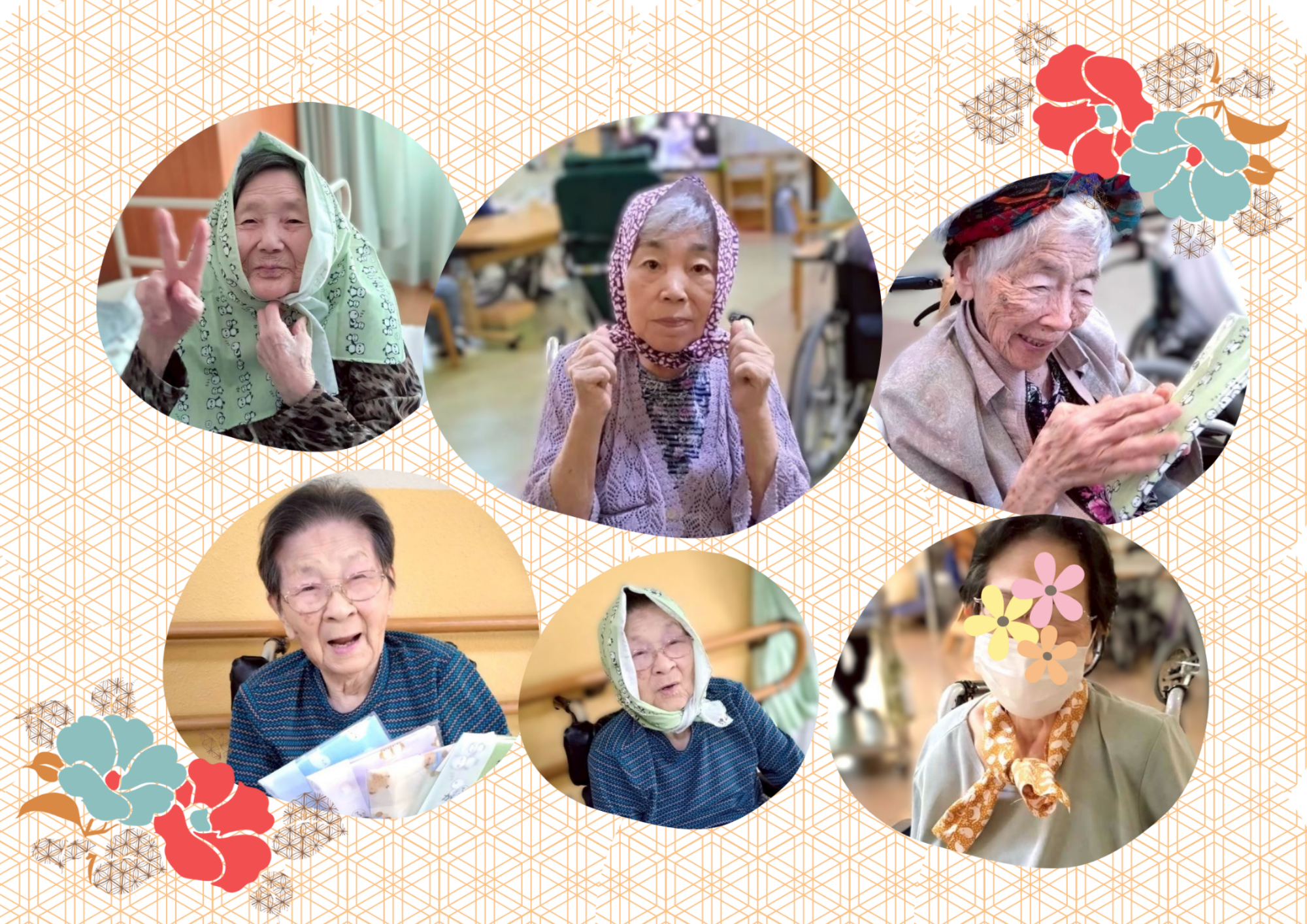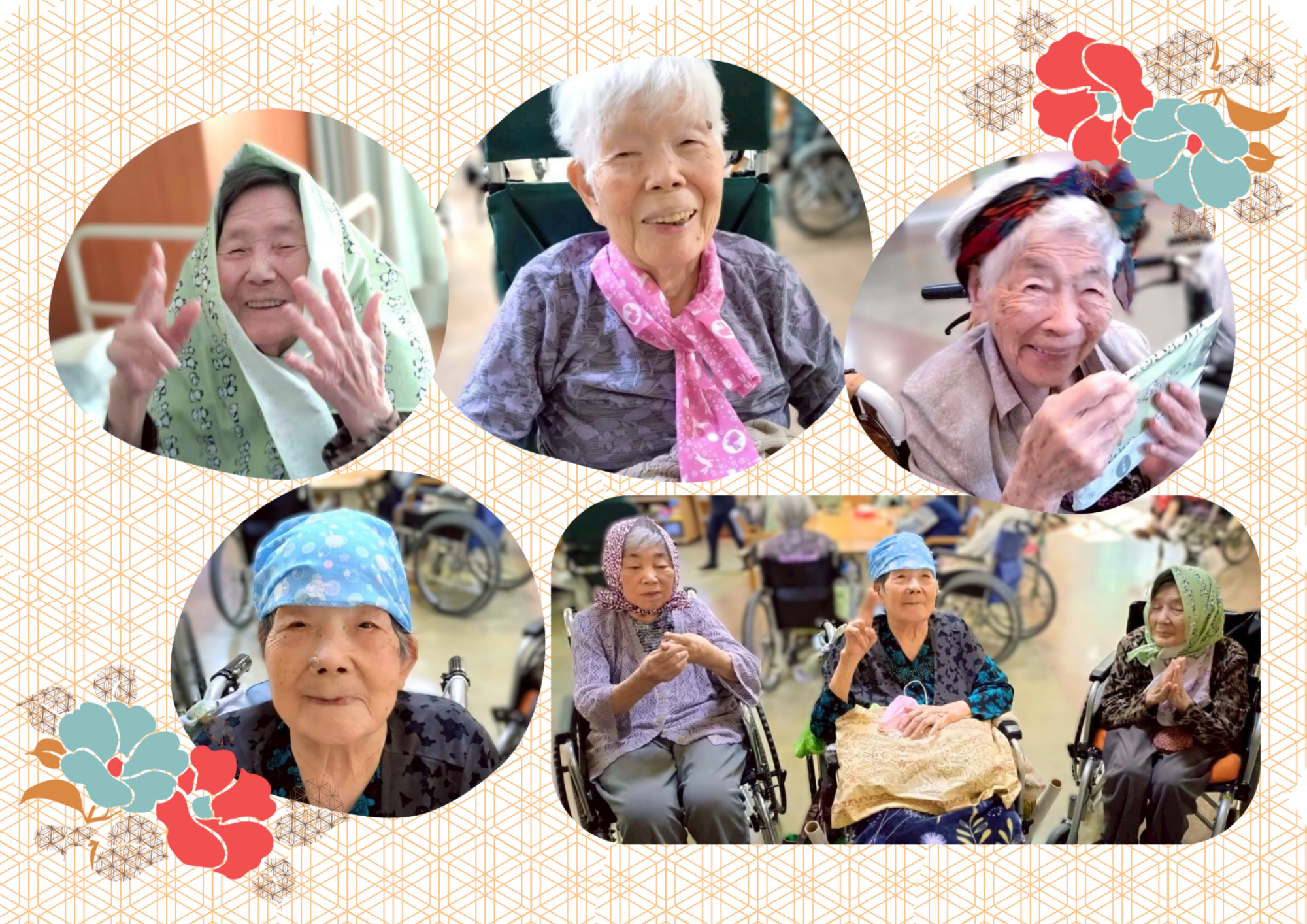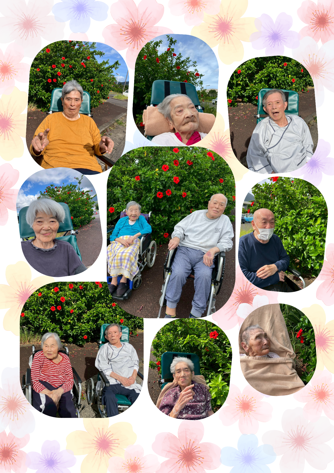 令和7年9月敬老の日など 9月15日敬老の日♪ 昼食に吹き寄せちらし寿司を提供させていただきました。みなさまのご長寿と健康に、心からお祝いを申し上げます✨ 岡山県でご活躍されている宇喜多秀家様より、敬老の日に合わせて、利用者の皆さまにかわいい手ぬぐいをたくさんご寄贈頂きました✨ 優しい手触りと、本当に可愛らしいデザインで、皆さまとても楽しそうに選んでいらっしゃいました♪ 頭にかぶってみたり、首元に巻いてみたり、皆さまとてもお似合いです✨ 本当にありがとうございました✨ 9月のとある日。この日は皆さま年に一度のレントゲン撮影の日でした。 町立病院の駐車場にて、お天気が良かったのでハイビスカスをバックに写真を撮らせていただきました✨ 過ごしやすい気候で、みなさまとても気持ちよさそうでした♪�