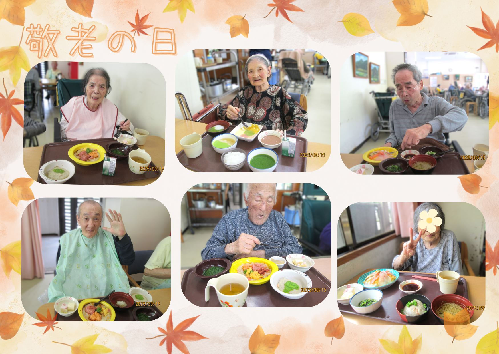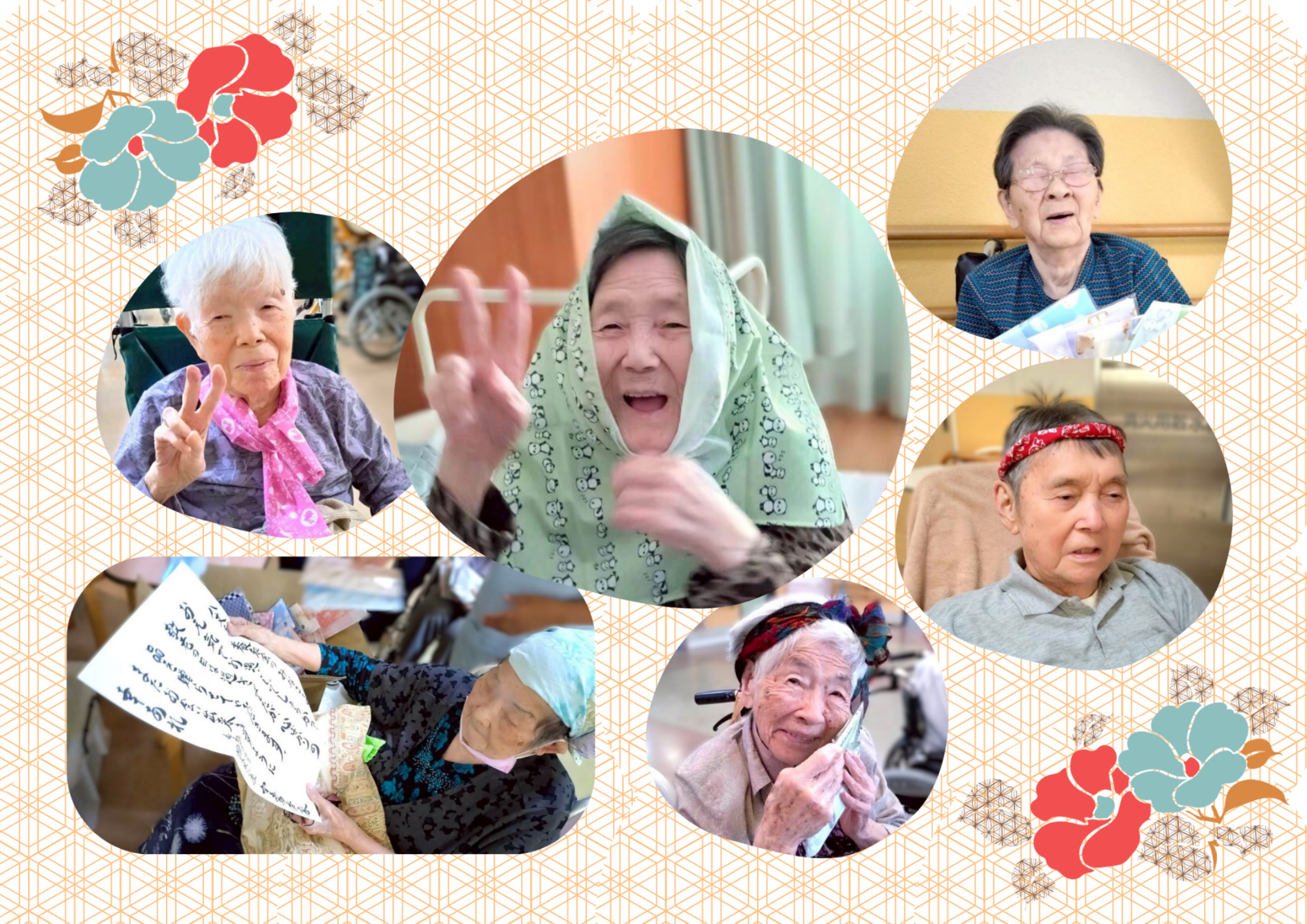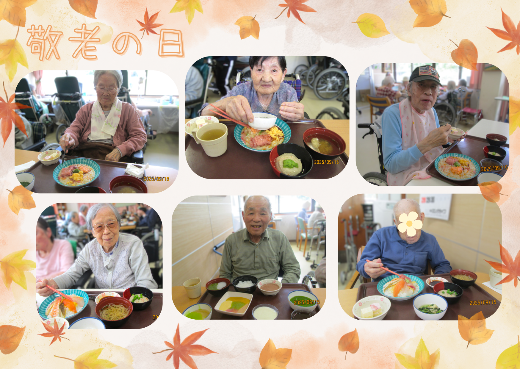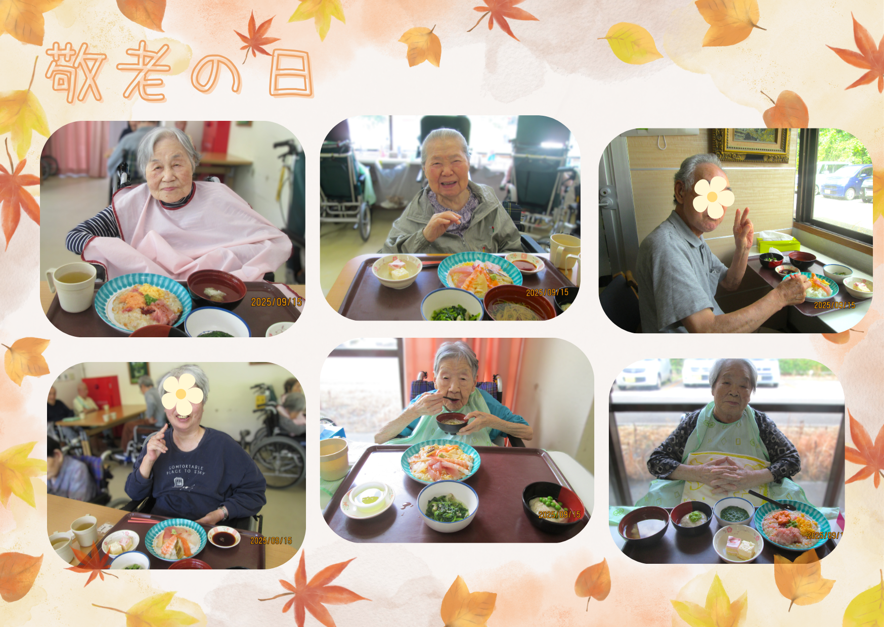 令和7年9月敬老の日など 9月15日敬老の日♪ 昼食に吹き寄せちらし寿司を提供させていただきました。みなさまのご長寿と健康に、心からお祝いを申し上げます✨ 岡山県でご活躍されている宇喜多秀家様より、敬老の日に合わせて、利用者の皆さまにかわいい手ぬぐいをたくさんご寄贈頂きました✨ 優しい手触りと、本当に可愛らしいデザインで、皆さまとても楽しそうに選んでいらっしゃいました♪ 頭にかぶってみたり、首元に巻いてみたり、皆さまとてもお似合いです✨ 本当にありがとうございました✨ 9月のとある日。この日は皆さま年に一度のレントゲン撮影の日でした。 町立病院の駐車場にて、お天気が良かったのでハイビスカスをバックに写真を撮らせていただきました✨ 過ごしやすい気候で、みなさまとても気持ちよさそうでした♪�